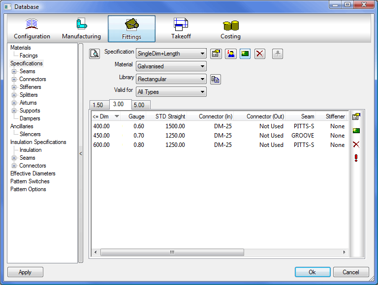 Setting up the specifications enables the automatic selection of parameters. Some patterns have the ability to override the Specification settings. It is not essential for ductwork users to set up or use specifications, however, when the specification table is correctly set up, it makes adding items to a job considerably easier and quicker. It is necessary to set up Connector and Seam parameters before defining specifications.