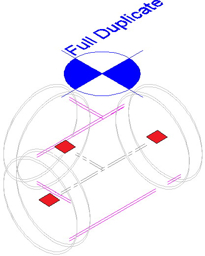The issue, if one or more exists in the model, is identified in the model with the appropriate AutoCAD block for that condition. For example, a full duplicate condition displays the MAP_FDuplicate block, as shown below.