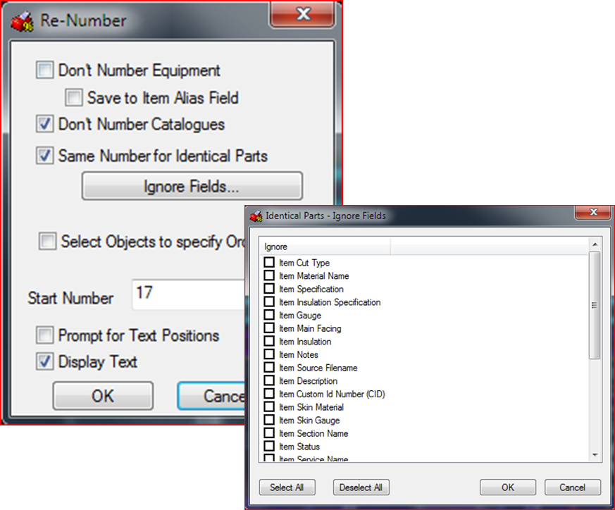 - Ignore Fields: This option is used in conjunction with the "Same Number for Identical Parts" option. It lets you specify which item materials and or properties to ignore when determining if parts are identical. For more information, see the "To renumber similar items with the same number" procedure described below.