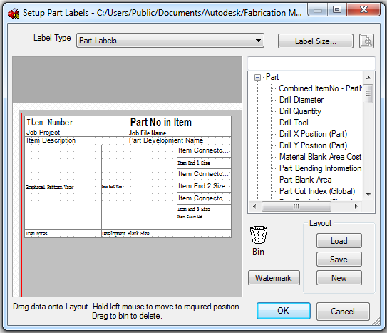 Once bar codes or QR codes have been configured as above, it is then possible to attach bar codes or QR codes to reports and labels, etc. The example below describes how to attach a bar code or QR code to a part label.