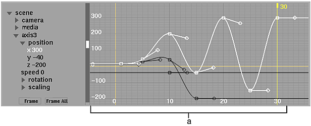 (a) The same Hermite curve after applying Tangent L of 36. A break is applied to all keyframes before the tangents are rotated.