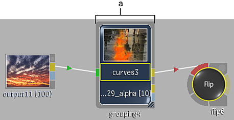 A clip with multiple outputs, (a stereo clip with left and right matte outputs, for example) can be displayed as a group node, allowing all output tabs to be displayed for connection.