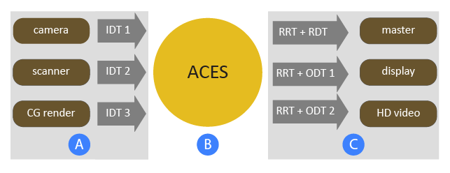 B | Input Device Transforms (IDTs) convert images to ACES. IDTs may be supplied by device vendors, software vendors such as Autodesk, other third parties, and AMPAS itself. In addition, you can author your own. The ADX to ACES transform is known as the "universal unbuild". Its inverse is the "universal build". |
