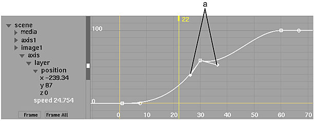 In this example, the speed curve makes the apple accelerate rapidly until it reaches frame 29, where it stops and continues moving slowly.