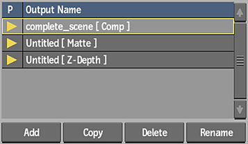 - Lists all of the existing outputs. Use the buttons below to populate the list with the outputs you want. To deselect an output from rendering (but keep it in the list), click the yellow arrow beside the output.