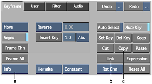 You can create an expression by linking the behaviour of one channel to another using Copy and Link. You can link different types of channels together. For example, make the scaling of a layer affect the rotation of another layer, or blur a layer by linking it to the position of an axis. Any change that occurs in the position of the axis is reflected dynamically in the layer blur.