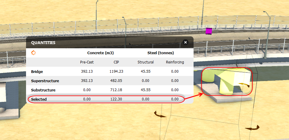 For a selected bridge or selected bridge components, open the Quantities panel to review the concrete and steel materials required to construct them.