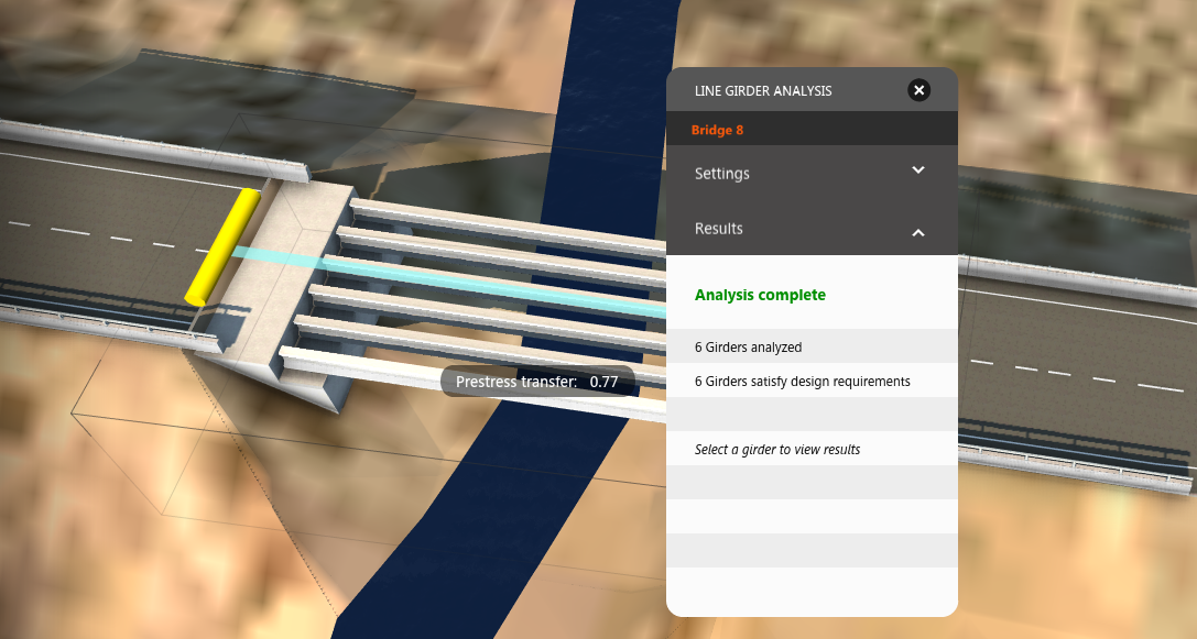 In the example below, all girders satisfied design parameters. Hovering over the girder displayed a prestress transfer performance ratio of 0.77 , which represents the design over the permissible value at the critical position along the girder.