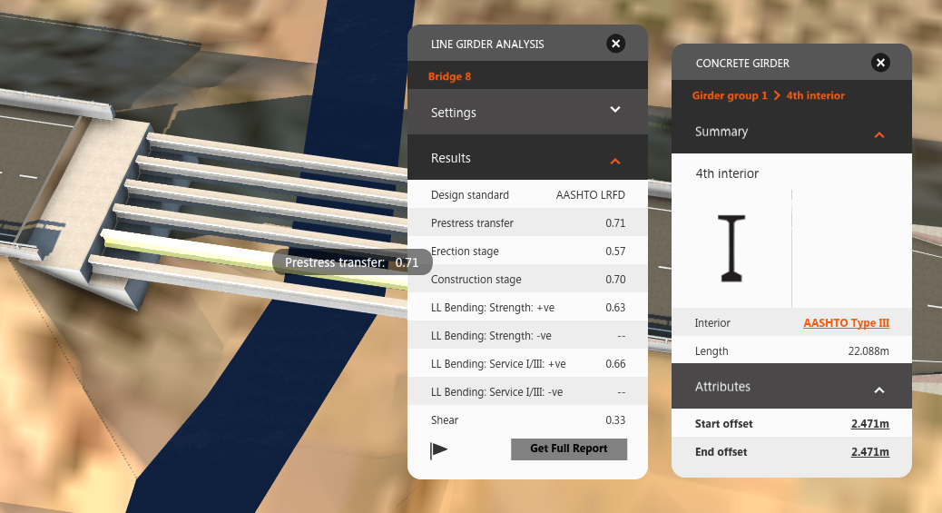 - Select an individual girder to view analysis results for that girder using the in-canvas asset card.