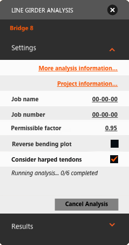 Line Girder Analysis allows you to review, adjust, and validate the design of all pre-stressed girders for any concrete bridge you select. View initial results in canvas or purchase detailed girder design documentation (in PDF format) using cloud credits.