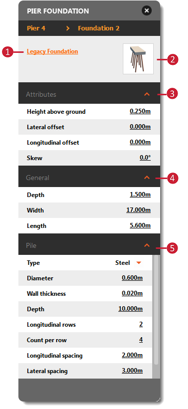 Choose a pier foundation style for your bridge from a catalog of parametric pier foundation components, then edit pier foundation settings as desired.