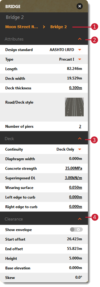 - Left-click on the bridge once to select the design road containing the bridge. The Roadway asset card will display.