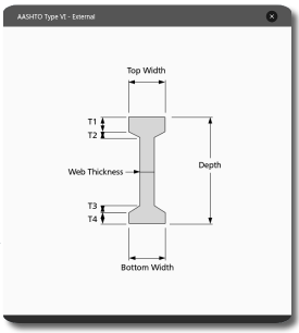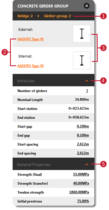 Girders groups are bridge components containing interior and exterior girders. Select a girder group to review and modify material properties or adjust gap and spacing for your girder group.