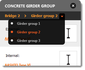 - Hover the mouse cursor over the Bridge or Girder Group name to view and/or select the desired bridge or girder group.