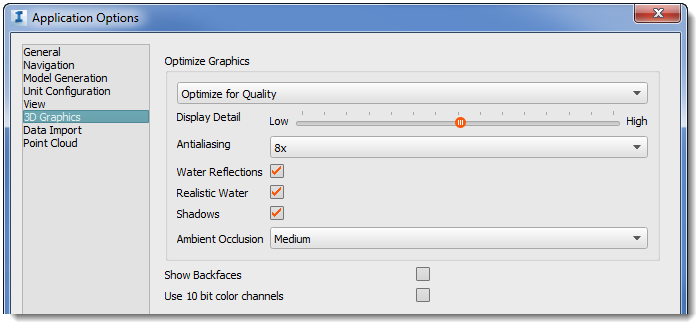 Control the optimization of graphics and other settings in your model such as display detail, antialiasing, ambient occlusion quality, shadows, water reflections, realistic water, and backface display options.