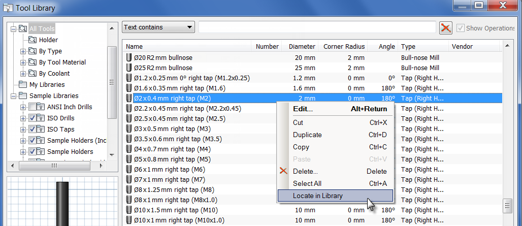When using the Search Folder function, you may want to open the corresponding library in which a given tool is stored. Simply right-click the tool and choose Locate in Library from the pop-up context menu.