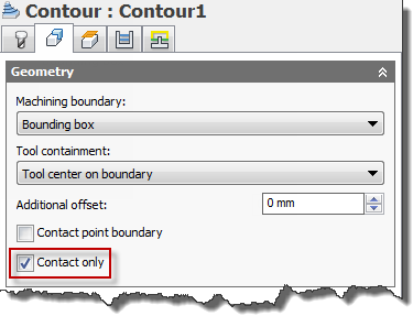 A Parallel toolpath with default settings: Contact only enabled Machining boundary = Silhouette Depth is automatic.