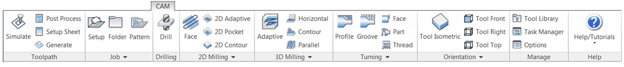 Once a part or assembly file is loaded and a strategy selected from the CAM ribbon, the CAM Browser becomes active replacing the familiar Inventor Model Browser. The CAM Browser lets you view and modify all machining-related data in the current part or assembly.
