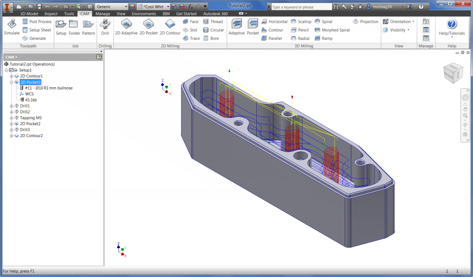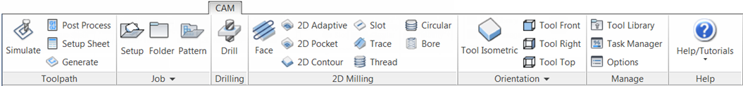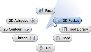 To create your first machining operation, simply select any of the toolpath strategies from the CAM toolbar. The type of toolpath required naturally depends on the geometry of your part. For a description of the individual machining strategies, please refer to the Inventor HSM Express Help topic: About 2D Machining Strategies.