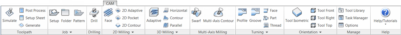 The command ribbons and the commands they offer for the three different versions of Inventor HSM appear below: