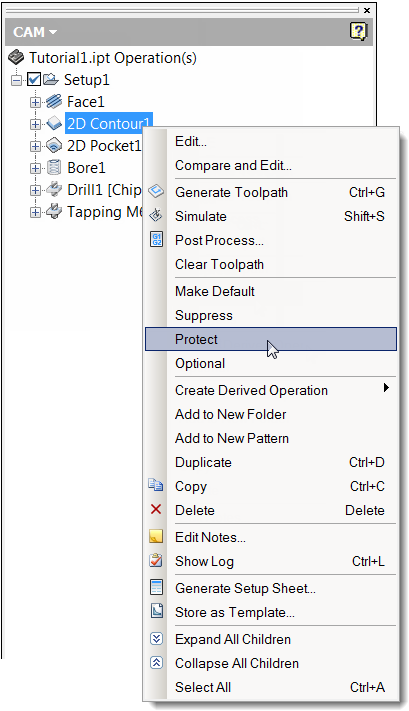 To protect an operation, right-click the operation from the CAM Browser and select Protect from the pop-context menu. Likewise, you can select Protect once more to unprotect it. Once unprotected, the operation is automatically marked invalid and must be regenerated.