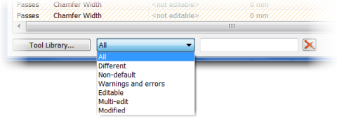 Entering text in the filter text box shows only the parameters with names matching the text. For example, entering "tool" shows all the tool-related parameters. Partial names are allowed; as an example, entering "slo" will show the "Slope", "From Slope Angle" and "To Slope Angle" parameters.