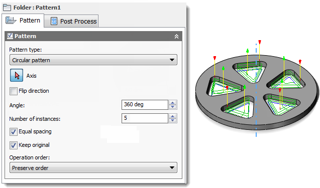 - Finally, from the Operation order: drop-down menu, choose whether the pattern should re-order the operations according to tool or operation, or preserve the order of the operations within the pattern.