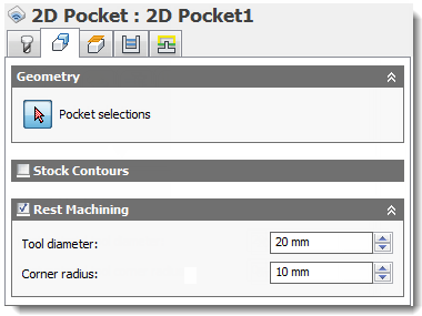 For example, if you start roughing with a 20 mm tool that does not fit in all areas of a given pocket, then make another 2D pocket operation with a smaller tool, and specify 20 mm for the Rest material tool diameter parameter.