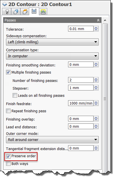 To manually control the ordering, select the individual contours in the order in which they should be machined and enable the Preserve order check box on the Passes tab.