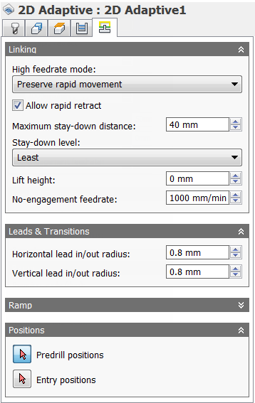Use this setting to control when to stay down rather than doing retracts when moving around obstacles. Generally, you will want the Adaptive strategy to stay-down more if your CNC machine does slow retracts compared to high feed moves. In such cases, increase the level value in the Stay-down level: drop-down menu. Values increase by increments of 10% with the Least setting at 0% and the Most setting at 100%.
