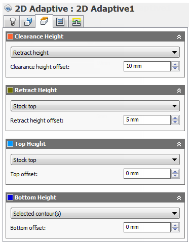 Bottom height determines the final machining height/depth and the lowest depth that the tool descends into the stock. Bottom height needs to be set below the Top. Bottom height is used together with the subsequent offset to establish the height.