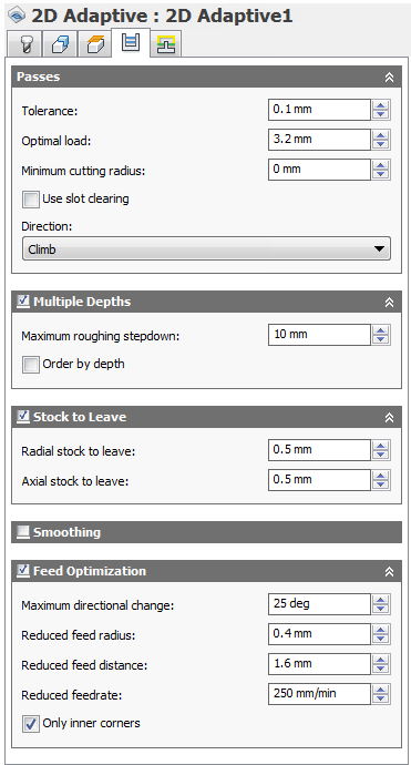 Smoothing works best when the Tolerance (the accuracy with which the original linearized path is generated) is equal to or greater than the Smoothing (line arc fitting) tolerance.