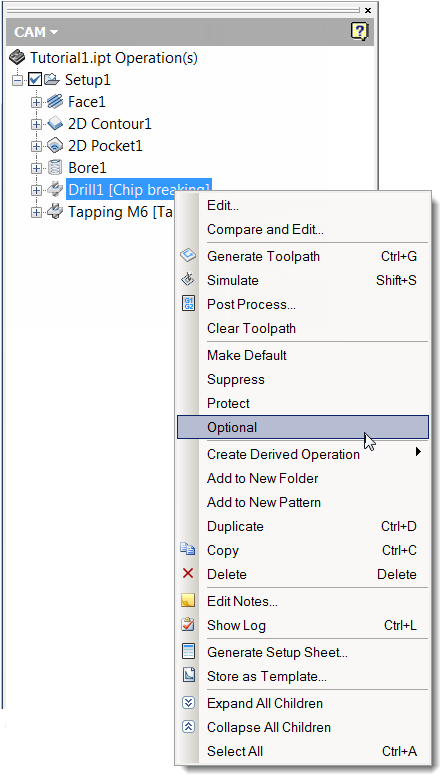 To make an operation optional, right-click the operation in the CAM Browser and select Optional from the pop-up context menu. You can make the operation non-optional again by selecting Optional once more.
