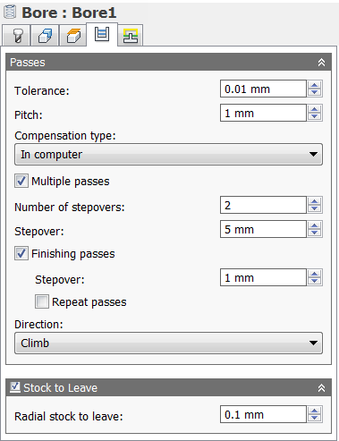 The Bore operation allows you to bore mill cylindrical pockets and islands by selecting the cylindrical geometry directly. The heights and depths are automatically derived from the selected geometry which allows you to machine varying geometry in a single operation.