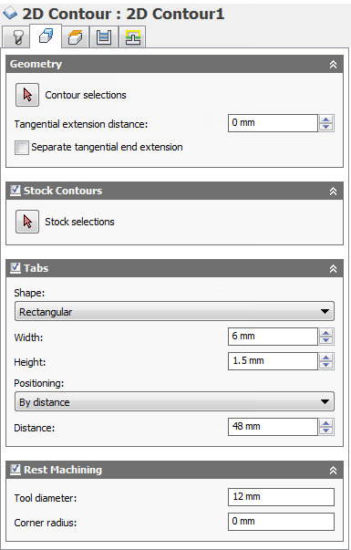 You can add tabs to the 2D Contour toolpath to hold the workpiece securely while all other material is machined away. Tabs are very useful when cutting thin plastic or wood materials using 2D routers.