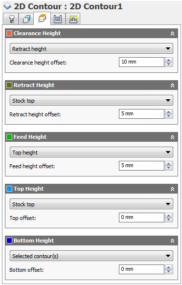 Bottom height determines the final machining height/depth and the lowest depth that the tool descends into the stock. Bottom height needs to be set below the Top. Bottom height is used together with the subsequent offset to establish the height.