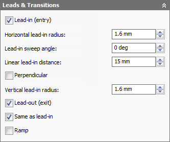 The Tangential extension distance setting provides a result similar to long linear leads, but allows you to retain the complete lead-in, including the horizontal arc, and the sweep angle.