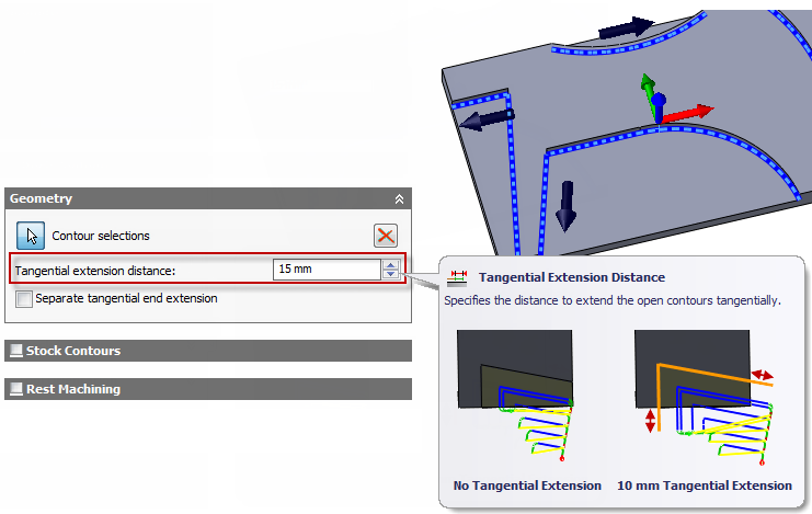 The Separate tangential end extension option lets you specify separate tangential start and end extension values for 2D contours. Enable this option and define a different extension distance for use at the end of an open contour by entering a value for the Tangential end extension distance parameter.