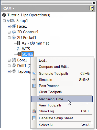 Calculating the machining time for an operation is an important aspect in the manufacturing process. Inventor HSM Express measures and calculates the machining time for a selected operation with high accuracy. From the CAM Browser, right-click the toolpath component of an operation and select Machining Time from the pop-up context menu.