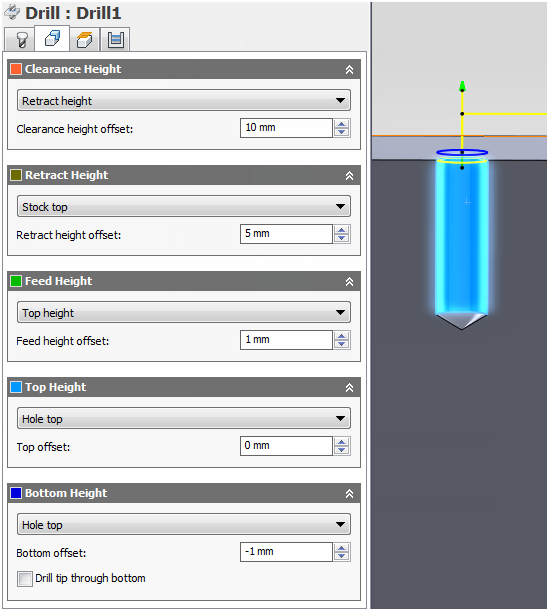 In some cases, you may need to drill only a part of the depth of the hole. As an example, you can select Hole top for the Bottom Height, in effect giving you the option to drill, say, 1 mm down from the top of every hole.