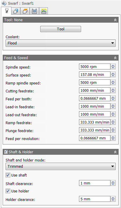 When using a tool with a holder, you can choose between one of five different shaft and holder modes, depending on the machining strategy. Collision handling can be done for both the tool shaft and holder, and they can be given separate clearances.