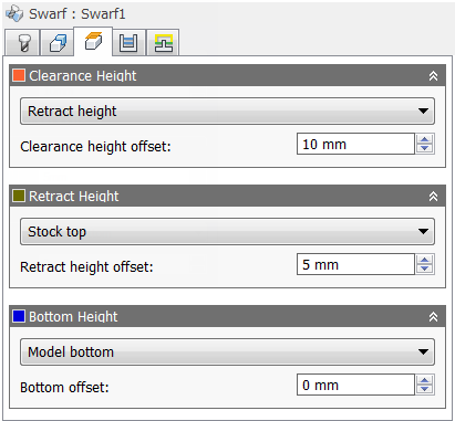 Bottom height determines the final machining height/depth and the lowest depth that the tool descends into the stock. Bottom height needs to be set below the Top. Bottom height is used together with the subsequent offset to establish the height.