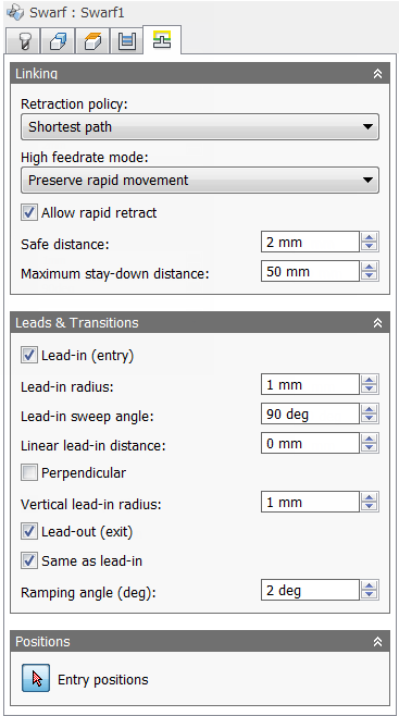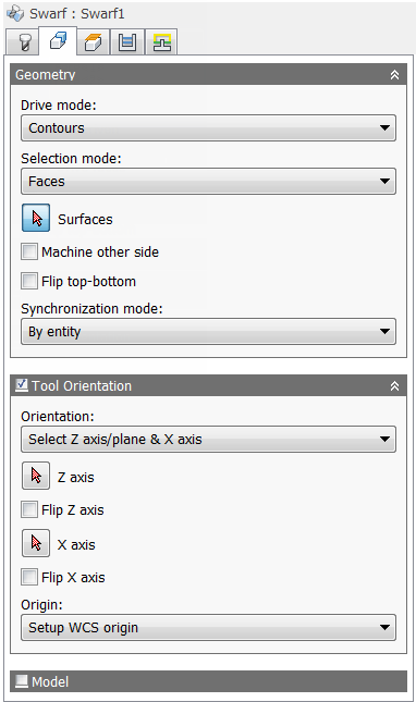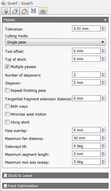 Swarf is a multi-axis strategy for machining with the side of the tool. This strategy supports both machining from contours only and from surfaces. When machining from contours only, you are required to manually synchronize the contours. Swarf supports several different modes that control how to machine down the sides.