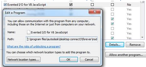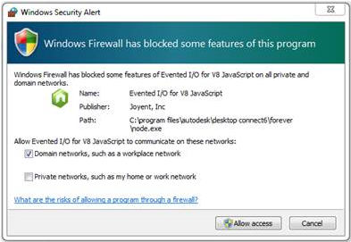 Solution: Remove existing exception in "%ProgramFiles%/Autodesk/Desktop Connect/forever/node.exe" in firewall setting, and restart Inventor. When prompted, click Allow access in the Windows Security Alert dialog box.