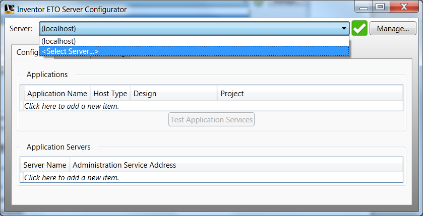 Inventor ETO Server Configurator provides the means to monitor remote servers. Additional defined servers display in the Server drop-down list. To define a new remote server, click <Select Server…> on the list.