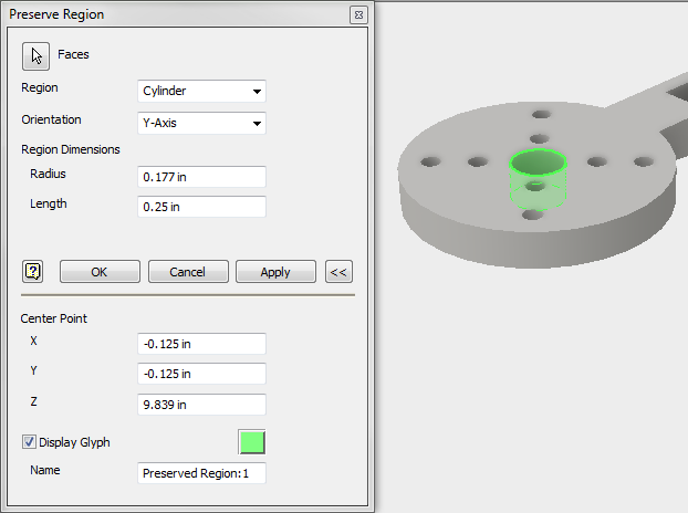 - If necessary, expand the Preserve Region dialog and modify the center point and dimensions of the region. You can also adjust the orientation for the cylinder type region. When complete click
