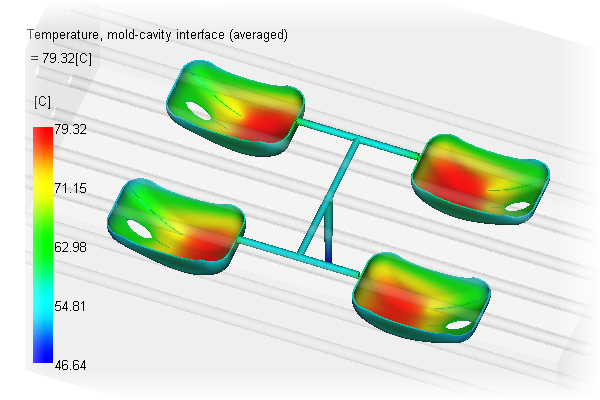 In this tutorial, you set up and run a finite element method (FEM) cooling analysis on a 4-cavity tool on the computer mouse cover. The FEM cooling analysis calculates both steady state and transient mold temperatures. Steady state is an average mold temperature. With transient, the mold temperature changes over time. In this tutorial, you run a steady state analysis. The mesh part model is provided. You create the cooling channels and mold in Synergy.