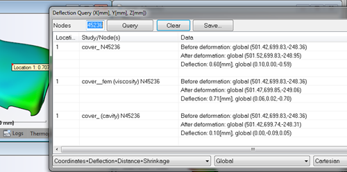 (), then click on the model in one of the studies and the result will appear in all the studies. The Examine lock feature is extended to warp results and the Deflection query dialog has been enhanced to make reading the results easier. The location, study name and node are all identified, as well as the expected data.