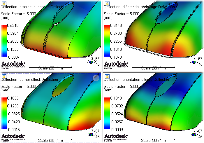 The warpage analysis outputs deflection plots for all effects, and the four variants. These plots allow you to compare the variants to each other and the all effects to determine the cause of warpage.