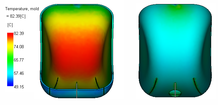 This result represents the cycle averaged mold temperature at the mold surface or plastic/metal interface. The variation in temperature for an amorphous material like the ABS used here, is best when within +/- 10°C from the target temperature. In this case, the target temperature is 70 C. The range for this part is well outside this range. Most of the part is too cool, in particular the cavity side. Also the core side is much hotter than the cavity side. This temperature distribution can contribute to the part warping.